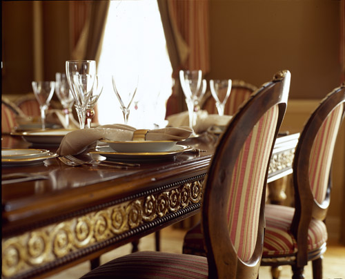 This close-up provides a detailed view of the dining table set for a tasteful evening of dining.