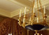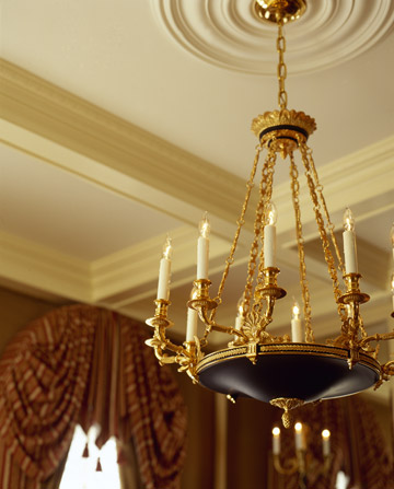 A chandelier hangs from the coffered ceiling, diffusing warm light throughout the space.