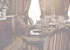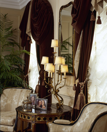 The damask upholstery is a soft compliment to the luxuriant fabrics of the window treatments in this living/music room.