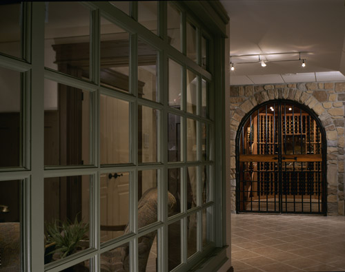 A wall of true divided square windows looks into the media room opening the space up to the bar area.