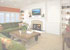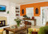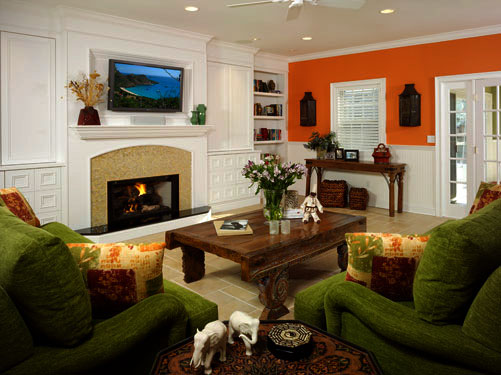This vibrant environment creates a welcoming spot for gathering family and friends. Large, comfy sofas covered in a soft chenille provide a space to cozy up in front of the beautiful fireplace (which sparkles with small mosaic tile accents) or to kick back and relax in front of the wall mounted plasma TV. Custom built-ins are the perfect solution for storage and accessorizing, but more importantly add a detailed focal point to the room.