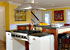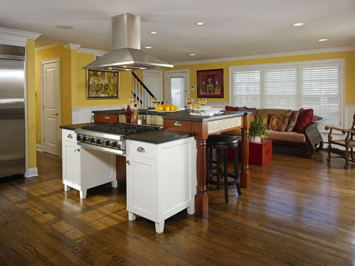 A kitchen / sitting room area in this Jersey Shore home provides an open kitchen plan with an eclectic flair. Transitional style and modern appliances meet farmhouse design in the custom cabinetry while the sleek teak furniture brings an island flavor to the home. Warm wood tones play off of the lively colors of the fabrics and finishes. A pop of color in artwork finishes the look of the space.